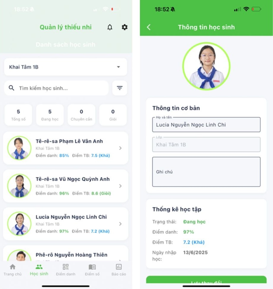 - Theo dõi và cập nhật danh sách thiếu nhi theo từng lớp, từng cấp học;