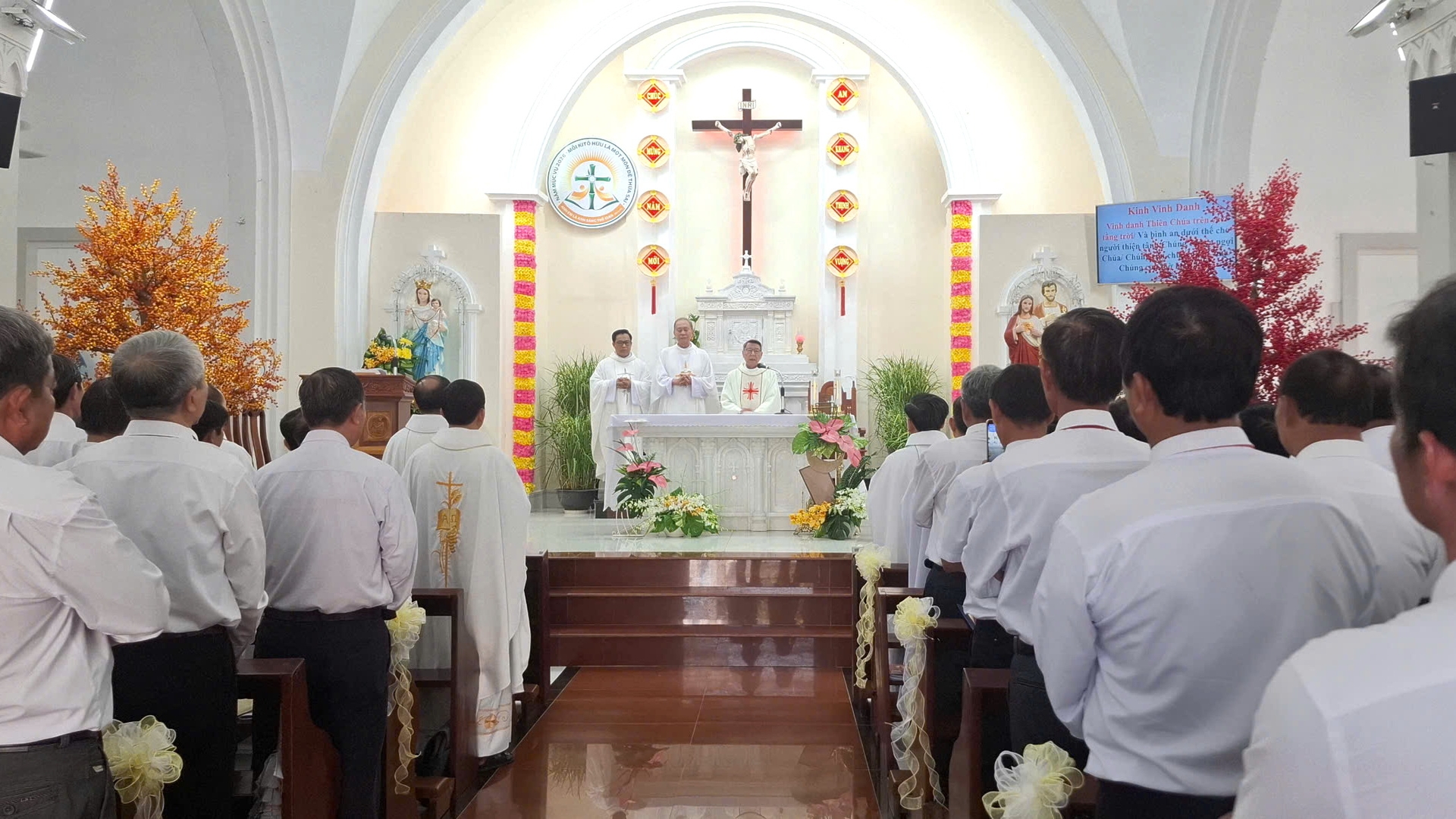 Lúc 10g15, Đức Cha Phê-rô Nguyễn Văn Khảm – Giám mục Giáo phận Mỹ Tho đã đến và chủ tế Thánh lễ. Đồng tế với Đức Cha có Cha Phaolô Trần Kỳ Minh – Tổng Đại diện, Cha Lu-y cùng quý Cha trong Giáo phận.