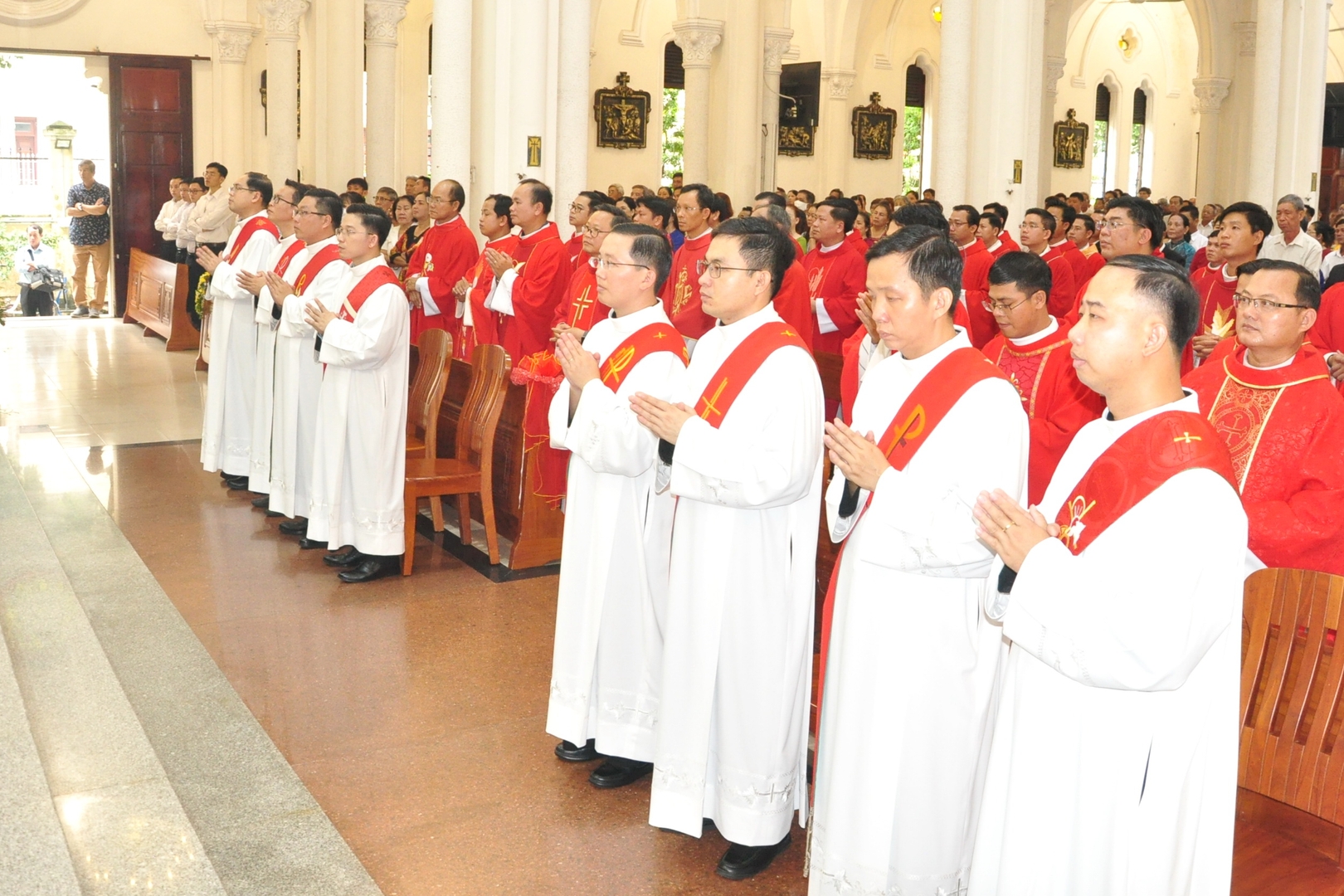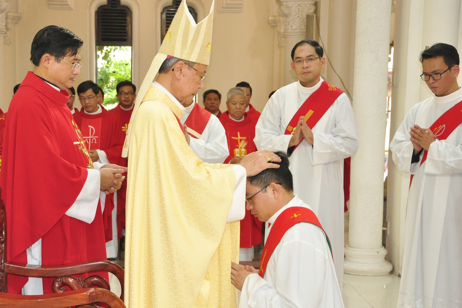 Lúc 09 giờ 30 thánh lễ truyền chức linh mục do Đức cha Phêrô Nguyễn Văn Khảm – Giám mục Giáo phận Mỹ Tho chủ sự. Đồng tế với ngài có sự hiện diện của cha Phaolô Trần Kỳ Minh – Tổng đại diện (TĐD) Giáo phận Mỹ Tho, cha Giuse Đỗ Xuân Vinh – Phó Giám đốc Đại Chủng viện thánh Giuse Sài Gòn, quý cha giáo, quý cha trong và ngoài giáo phận. Tham dự thánh lễ còn có quý tu sĩ, quý ông bà cố và gia đình của các tiến chức, cùng bà con giáo dân trong giáo phận.