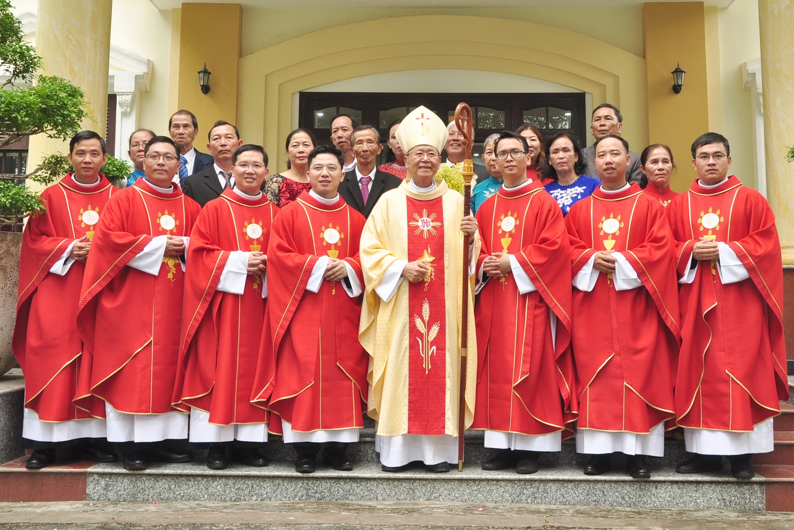 Thánh lễ kết thúc lúc 11g00. Đức cha chụp hình lưu niệm cùng các tân linh mục và người thân.