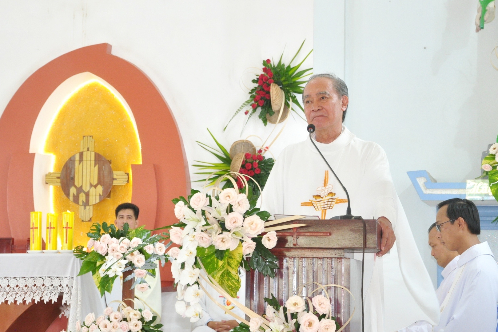 Cha TĐD nói tiếp, theo dòng lịch sử của Giáo hội, không những các tông đồ mà còn từ thế hệ này sang thế hệ khác vẫn tiếp tục sứ mạng đó - sứ mạng đem tình yêu thương và phục vụ đến với con người. Cụ thể là gương cha thánh Gioan Maria Vianney mà chúng ta nhớ đến hôm nay. Cha thánh đã hi sinh bản thân phục vụ đoàn chiên lạc xứ Ars. Bằng lời cầu nguyện của ngài trước Thánh Thể mỗi ngày, ngài đã hoán cải được một họ đạo Ars xa rời tình yêu Chúa, sa đọa trong lối sống trụy lạc, buông thả. Cha TĐD liên hệ đến đời sống linh mục, khi ngài nói: Sứ mạng của người linh mục, như chiếc cầu nối để thông ban tình yêu của Thiên Chúa đến cho cộng đoàn. Đồng thời, linh mục cũng dâng lên Thiên Chúa tất cả những ưu tư, muộn phiền, đau khổ, vất vả thậm chí cả tội lỗi của cộng đoàn lên Thiên Chúa. Từ đó Thiên Chúa sẽ thứ tha, an ủi, yêu thương và chúc phúc. Cách đặc biệt trong thánh lễ hôm nay, cha Phaolô Trần Duy Tân được Đức Cha Phêrô sai đến với Giáo xứ Mỹ Long, cha TĐD rất mong bà con giáo dân hết lòng cộng tác với cha sở mới để làm cho đời sống đức tin và tình yêu mến Chúa nơi cộng đoàn Giáo xứ Mỹ Long ngày càng triển nở đẹp lòng Chúa.