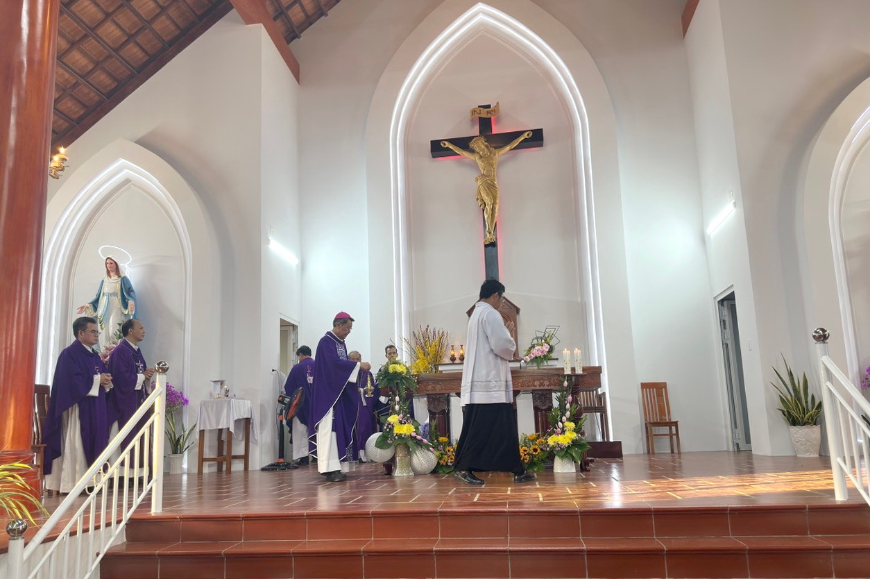 (WGPMT) Lúc 16g45 ngày 18 .02.2024 Đức Cha Phêrô Nguyễn Văn Khảm – Giám mục Giáo Phận Mỹ Tho chủ sự thánh lễ làm phép nhà thờ và bàn thờ tại Giáo xứ Hòa Đồng ngụ ấp Hạ, thị trấn Vĩnh Bình, huyện Gò Công Tây, tỉnh Tiền Giang.