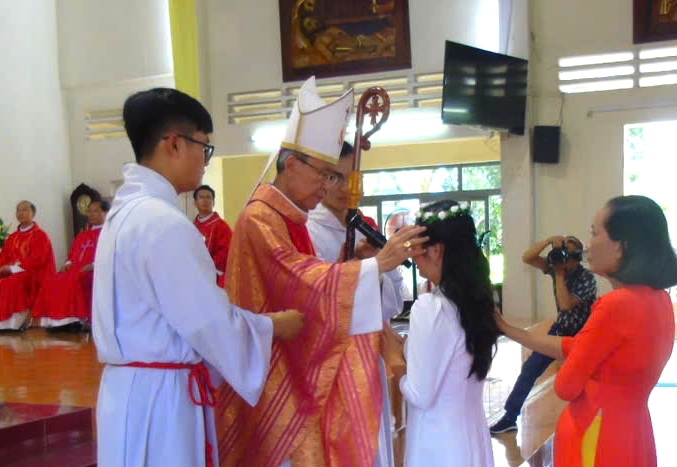 Đức cha Phêrô ban Bí tích Thêm Sức cho các em thiếu nhi