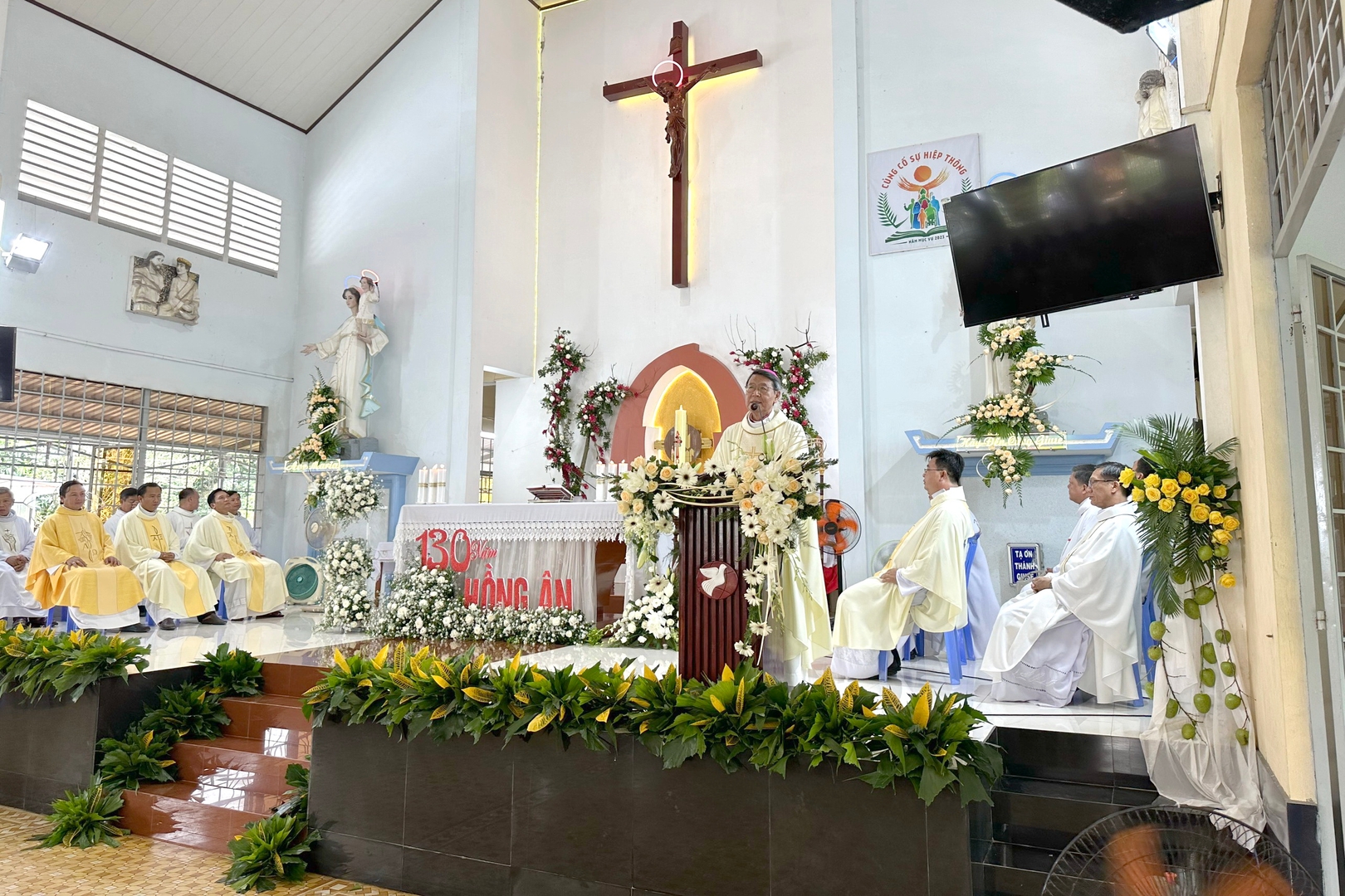 Trong bài giảng lễ, từ đoạn Tin Mừng (Mt13,54-58) - Lễ mừng kính Thánh Giuse Thợ, Đức Cha Phêrô nói đến tâm tình tạ ơn Chúa, vì có Chúa đồng hành, gìn giữ giáo xứ vượt qua nhiều thăng trầm của lịch sử Giáo Hội và xã hội. Đặc biệt qua nhiều đời cha sở, Giáo xứ Mỹ Long đã phát triển hơn nhiều về cơ sở vật chất cũng như đời sống đạo đức của bà con giáo dân. Qua đó Đức Cha mời gọi mọi người trong giáo xứ hãy tiếp tục cộng tác với cha sở để tiếp tục làm phát triển đời sống đức tin cũng như cũng cố sự hiệp thông trong giáo xứ.