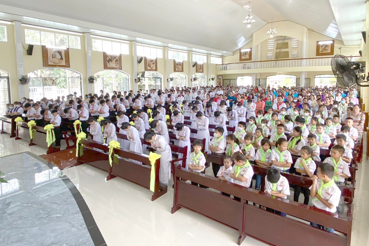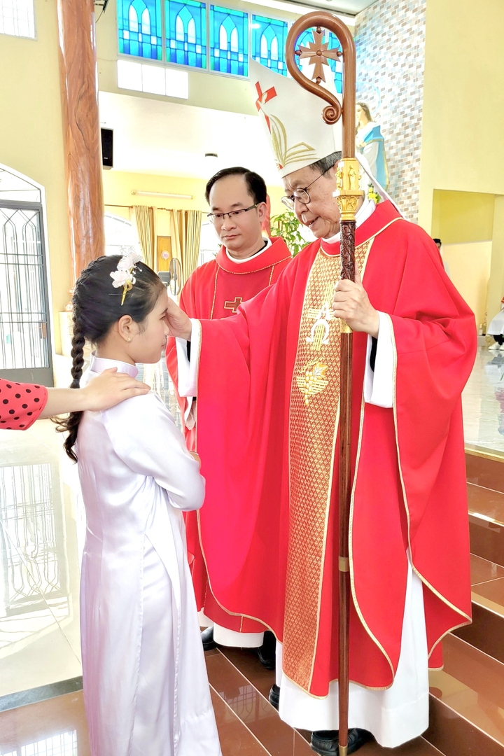 Sau khi cha phó Martinô công bố Tin Mừng, Cha sở Phaolô giới thiệu với Đức Cha 60 em thiếu nhi đã hoàn thành chương trình Giáo lý Thêm sức và xin Đức Cha ban Bí tích Thêm Sức cho các em.