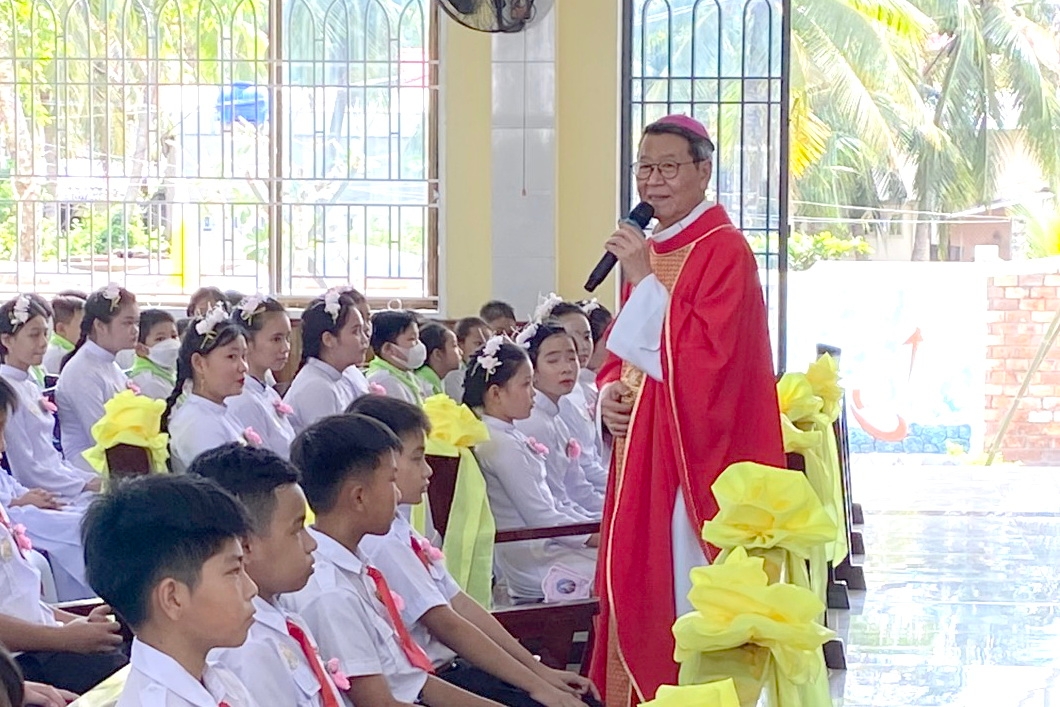 (WGPMT) Giáo xứ Rạch Cầu hân hoan chào đón Đức Cha Phêrô Nguyễn Văn Khảm - Giám mục Giáo phận Mỹ Tho về dâng thánh lễ ban Bí tích Thêm Sức cho 60 em thiếu nhi thuộc 2 Giáo xứ Rạch Cầu và Vĩnh Hựu.