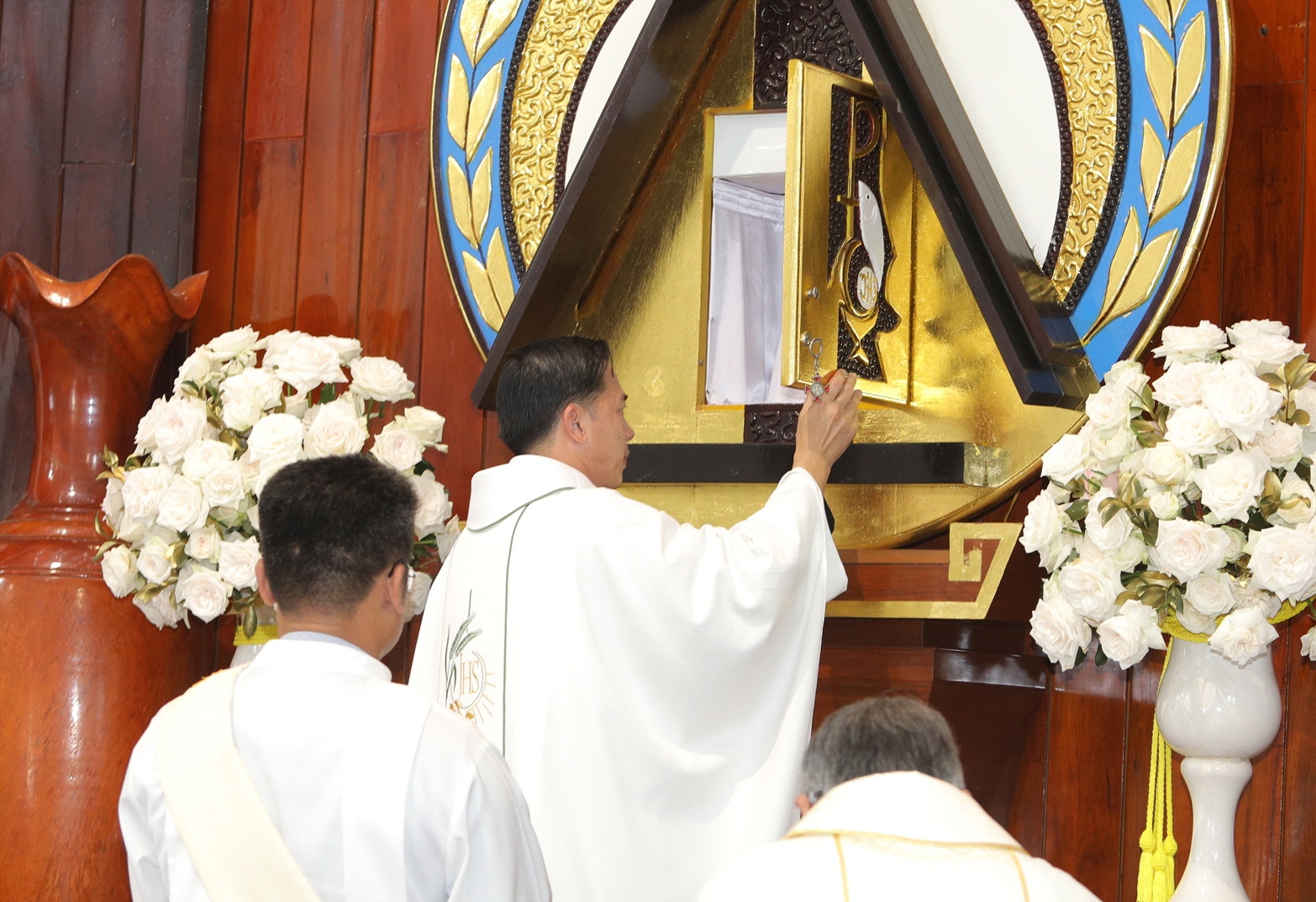 Cha Tân chánh xứ Tôma mở cửa Nhà Tạm và xông hương Mình Thánh Chúa