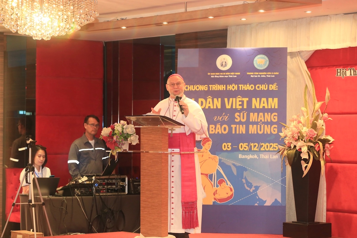 Hội thảo quốc tế với chủ đề “Di dân Việt Nam với sứ mạng loan báo Tin mừng” đã diễn ra từ ngày 03 đến 05 tháng 12 năm 2025 tại khách sạn Grand Lord, Bangkok, Thái Lan. Sự kiện được tổ chức bởi Trung tâm Nghiên cứu Tôn giáo và Truyền thông Xã hội châu Á (ARC) thuộc Đại học St. John’s, phối hợp cùng với Ủy ban Mục vụ Người Di dân Việt Nam của Hội đồng Giám mục Thái Lan. Hội thảo đã thu hút khoảng 100 tham dự viên, bao gồm các linh mục, tu sĩ nam nữ và giáo dân đến từ nhiều quốc gia như Ý, Hoa Kỳ, Đức, Na Uy, Đài Loan, Philippines, Papua New Guinea, Lào, Thái Lan và Việt Nam.