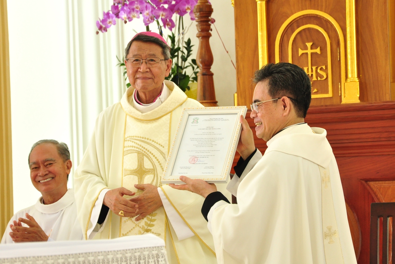 Đức cha Phêrô trao văn thư Cung hiến cho Cha sở Phaolô Thiện