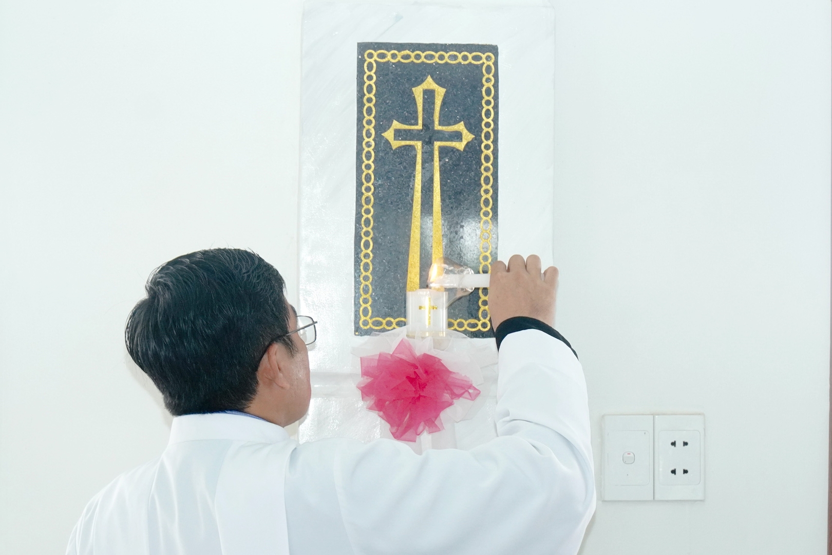 Thầy giúp lễ thắp sáng nhà thờ