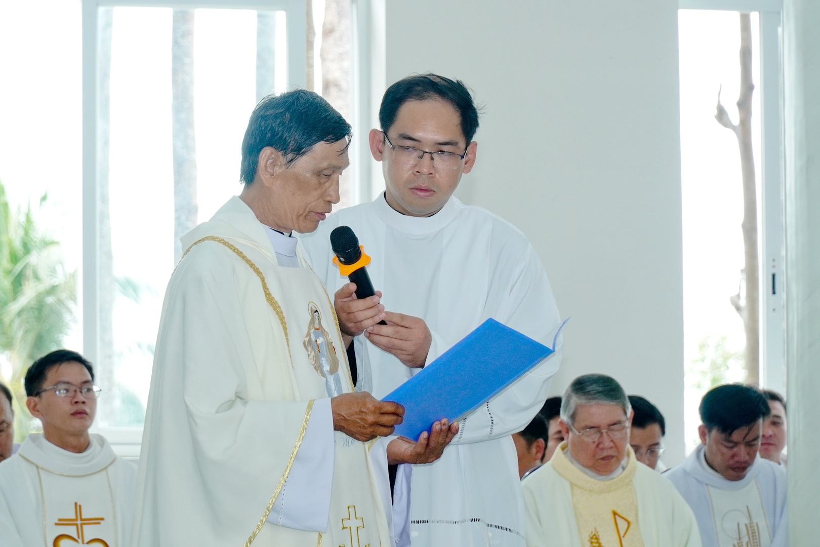 Sau cùng, Cha Giuse Nguyễn Văn Nhạn – Hạt trưởng hạt Tân An đọc Văn thư công bố cung hiến nhà thờ Giáo xứ Tân Đông và Đức Cha Phêrô đã trao Văn thư cung hiến nhà thờ cho Cha sở Phêrô.