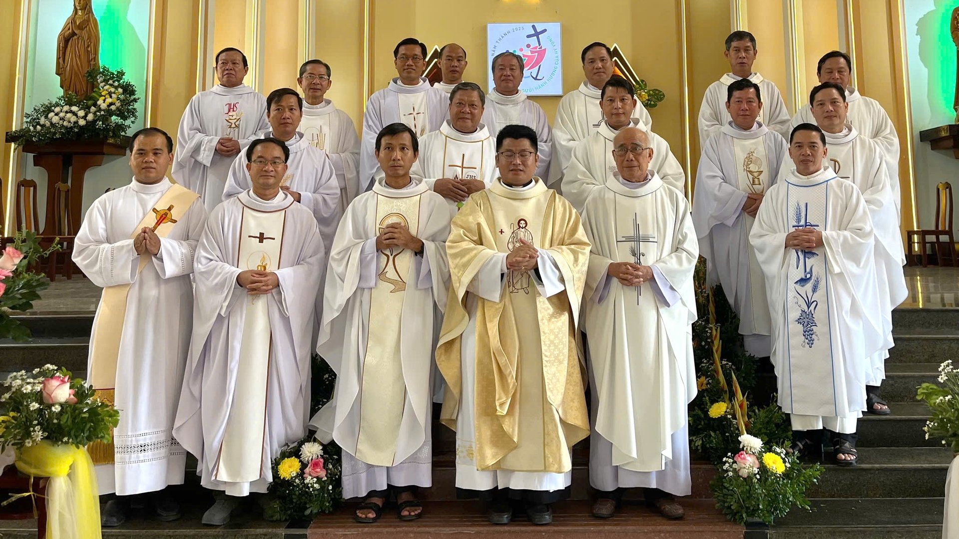 Kết thúc thánh lễ, cha mới cùng chụp hình lưu niệm với quý cha tại cung thánh.
