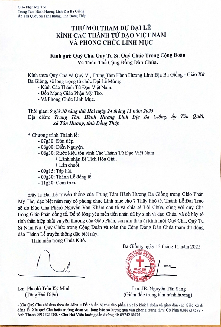 Thư mời tham dự đại lễ kính các Thánh Tử đạo Việt Nam và truyền chức linh mục